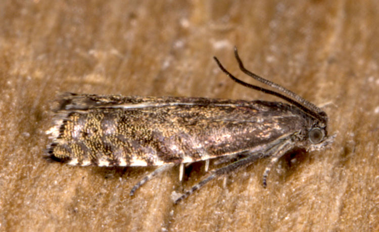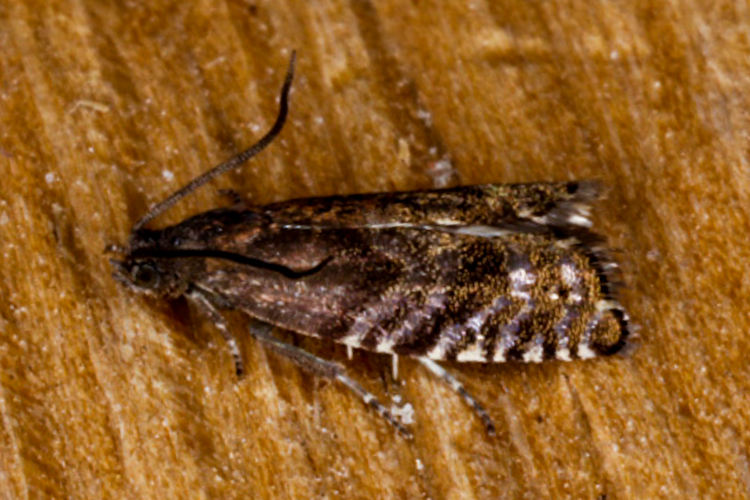 Nationally scarce (Nb) in coniferous woodland and plantations throughout much of Britain. In Hampshire local amongst spruce in both vice-counties and, although not often seen, it may be bred from fallen cones collected in early spring - this was the case for the first county record in 1986, in Ampfield Wood (VC11) and in Feb 2023, 12 were reared from cones collected in Chawton Wood: all other records in our area relate to adults to light. New to the Isle of Wight in May 2016 during a 6-day spell when 22 individuals were reported across all three vice-counties, and therefore almost certainly relating to a dispersal event. Wingspan 10-15 mm. Reminiscent of