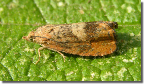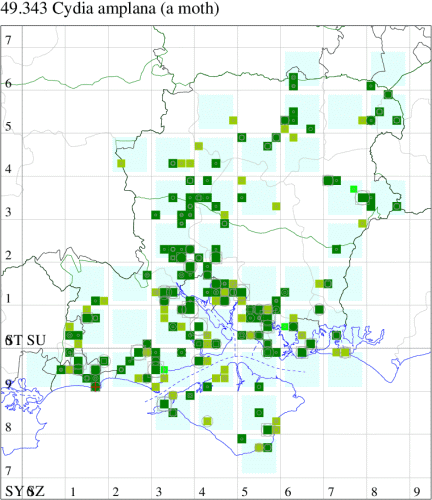 Rare immigrant, appearing in increasing numbers in the West Country, notably at Portland, Dorset. The first authenticated record was from South Devon in 1990. In Hampshire since the first record at Fareham in 1997, recorded increasingly along much of the south coast, appearing in northern Hampshire for the first time in 2008 at Shortheath Common and on the Isle of Wight at Freshwater in 1996. Wingspan 16-20 mm. A highly distinctive and unmistakable species. Larva feeds within nuts of Oak, Hazel, Beech and Walnut.
