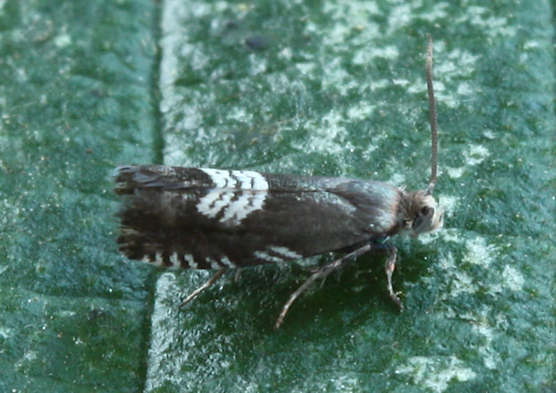 Common in dry grassland and flower meadows throughout much of the British Isles, most frequently in the south. In Hampshire and on the Isle of Wight recorded from all three vice-counties in open country amongst clovers, usually in small numbers but sometimes commonly, chiefly in south-eastern parts of the county, flying late in the afternoon sunshine. Wingspan 8-10 mm. Readily distinguished by its characteristic dorsal blotch which is divided into four white striae [Bradley]. Larva feeds within flowerheads of White Clover and Red Clover, subsequently living within a leaf-fold.