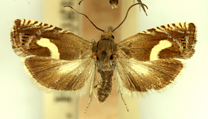 G. lunulana by the relatively broad, truncate forewing and the thicker and more strongly curved medio-dorsal blotch, which is usually dilated apically, and the well-developed ocellus [Bradley]. Larva feeds within seedpods of Vetch, over-wintering in a cocoon.