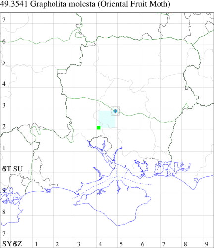 G. funebrana by its generally smaller size, the better defined fasciate markings and white discocellular spot of the forewing, and in the male also by the patch of pale scales along the middle of the termen of the hindwing [Bradley]. Larva feeds within fruit of Peach and Pear, no evidence of breeding in the UK.
