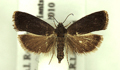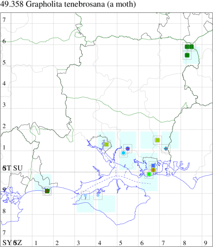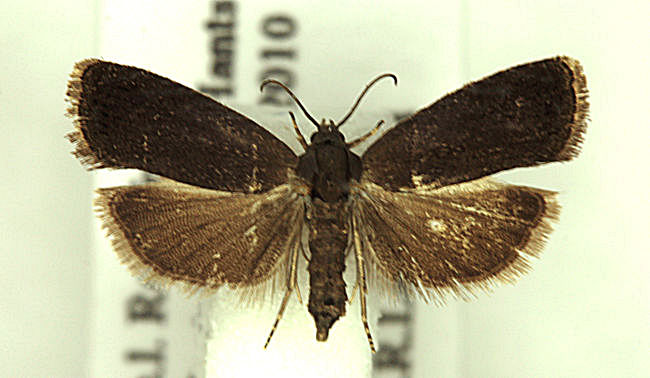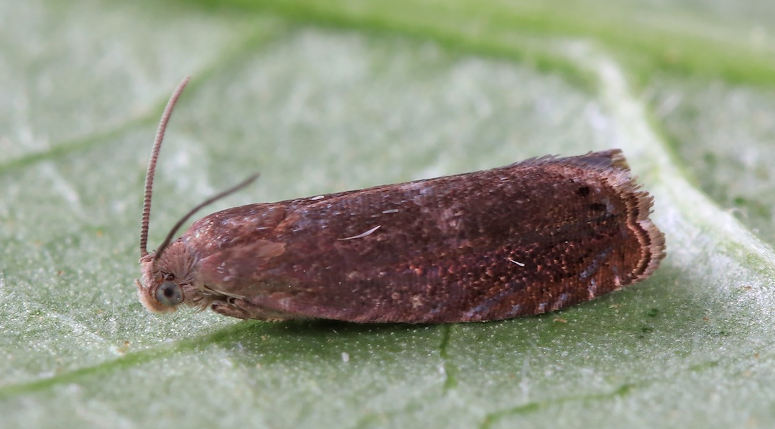 G. funebrana by the greyish white labial palpi and frons and the comparatively uniform purplish fuscous general coloration of the forewing [Bradley]. Larva feeds within fruit of Dog-rose and Cultivated Rose, over-wintering in a cocoon.