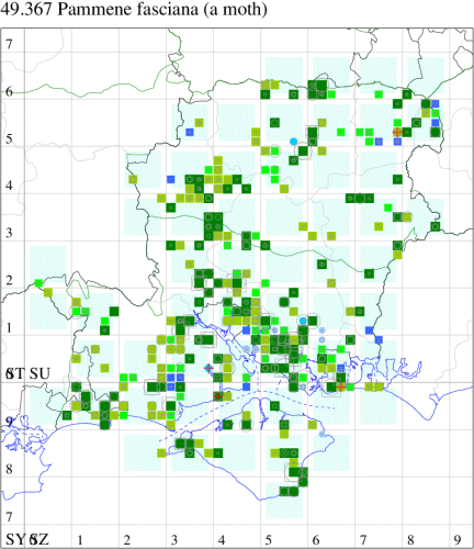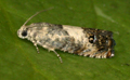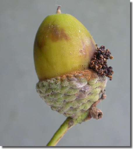 Local in deciduous, especially oak, woodland, and parkland throughout much of England and Wales, where more widely distributed in the south. In Hampshire common in oak and sweet chestnut woods throughout, but perhaps under-recorded on the Isle of Wight. Wingspan 13-17 mm. The large, subfalcate medio-dorsal blotch, the presence of two or three sometimes contiguous black spots above the pre-tornal marking and the usually extensive series of black dashes in the ocellus are characteristic [Bradley]. Larva feeds within fruit of Sweet Chestnut and Oak, forming spongy galls, and over-wintering in a cocoon.