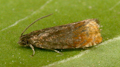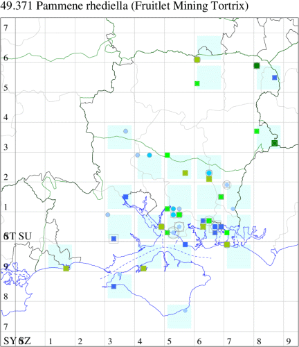 Local in hedgerows, orchards and scrub throughout much of the British Isles, less numerous in the north. In Hampshire and on the Isle of Wight most likely to be encountered in the south-east, with very few recent records in the north of the county or on the Island. Wingspan 9-12 mm. The coppery red general appearance of the forewing with the dark purplish brown coloration of the basal two-thirds and the well-demarcated ferruginous-orange distal area are characteristic [Bradley]. Larva feeds within unripe fruit of Hawthorn, Midland Hawthorn, Rowan, Apple and Crab Apple, over-wintering in a cocoon.