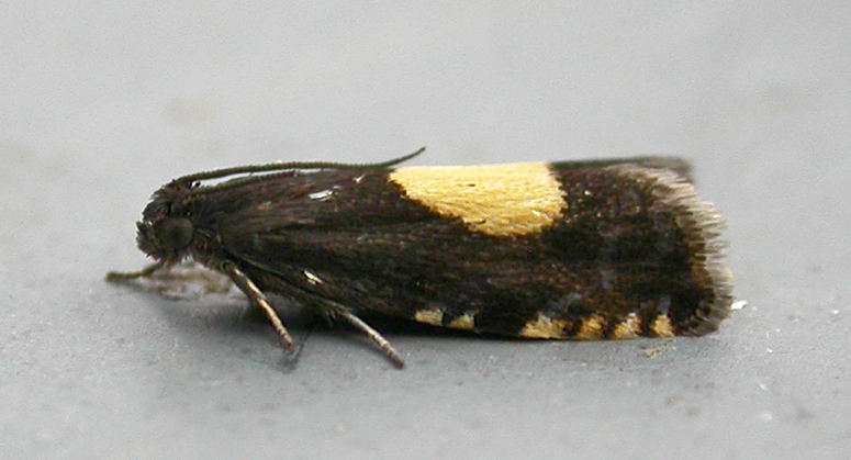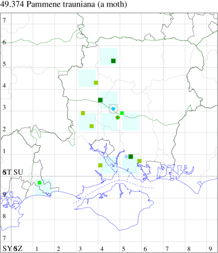 Nationally scarce (Na) in woodland and scrub in parts of south-eastern England. In Hampshire a rare moth with a very erratic distribution having been found on chalk downland at St Catherine's Hill in 2003 and Magdalen Hill Down in 2008, to the semi-ancient deciduous forest at Botley Wood (latest in 2023). Not recorded from the Isle of Wight to date. Wingspan 10-13 mm. Differs from