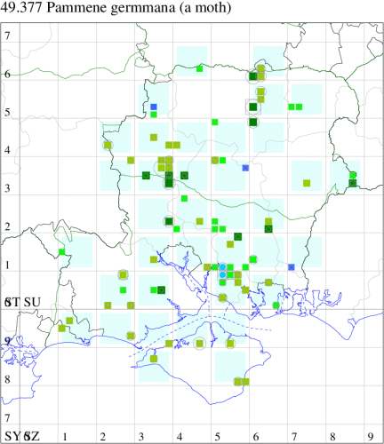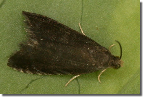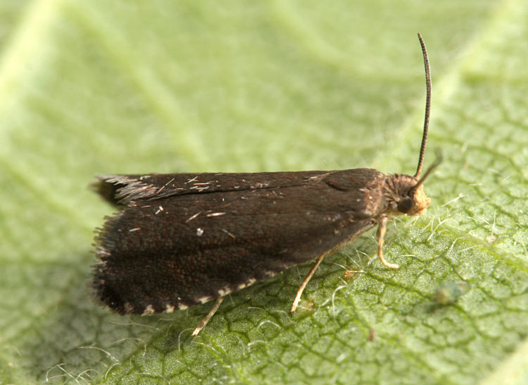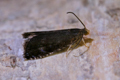 Local in hedgerows and open woodland throughout much of England, in recent years seldom found north of the Midlands. In Hampshire recorded in numbers only in Botley Wood and Pamber Forest, otherwise an uncommon and obscure species. First recorded from the Isle of Wight in 2012. Wingspan 10-14 mm. Day-flying. The satiny black-brown general coloration of the forewing, contrasting with the cream-white ground colour between the costal strigulae, and the bluish metallic striae are characteristic, however confusion with