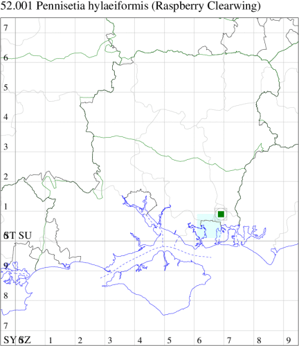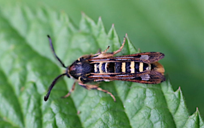 Recorded infrequently through accidental importation in raspberry canes from mainland Europe, this recent addition to the British list was first discovered in Britain on the Hertfordshire-Cambridgeshire border in 2007/8, with subsequent records in Bedfordshire. The first for Hampshire was an individual to pheromone lure in Waterlooville (VC11) in July 2024 . Wingspan 22-32 mm. Larva feeds within roots of Raspberry, over-wintering twice.