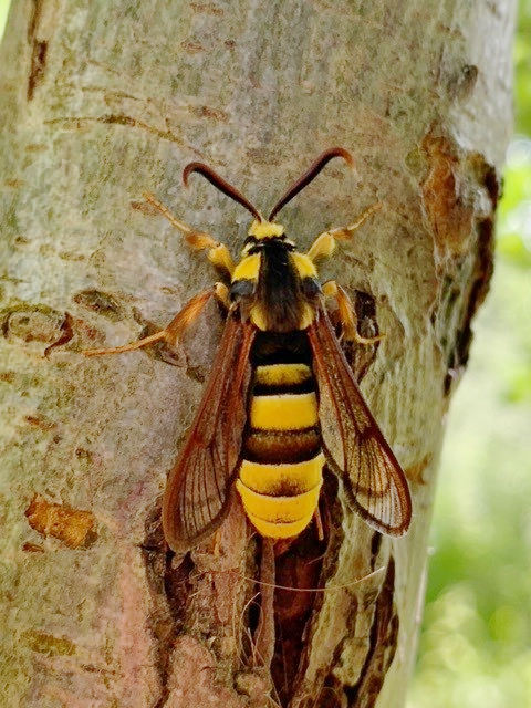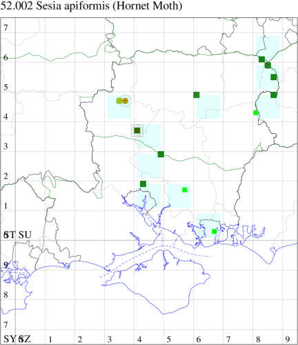 Nationally scarce (Nb) in open areas with scattered trees in central and southern England, though also recorded from Durham and north and south Wales; local in Ireland with scattered records from a few eastern and southern counties (MBGBI Vol 2). In Hampshire known from only a handful of sites, notably at Chilbolton, where known for many years. Not recorded from the Isle of Wight to date. Wingspan 33-46 mm. Day-flying. Mainly recorded in the larval form, but the early stages are difficult to find during the winter months and the species' true distribution remains largely unknown; the use of the HOR pheromone lure is expanding our knowledge of the true distribution of this spectacular insect. Distinguished from the similar