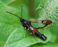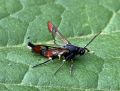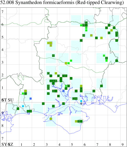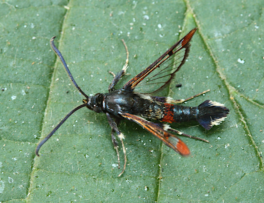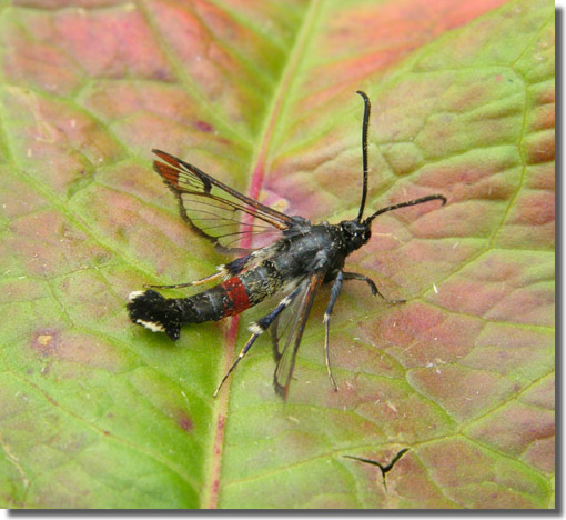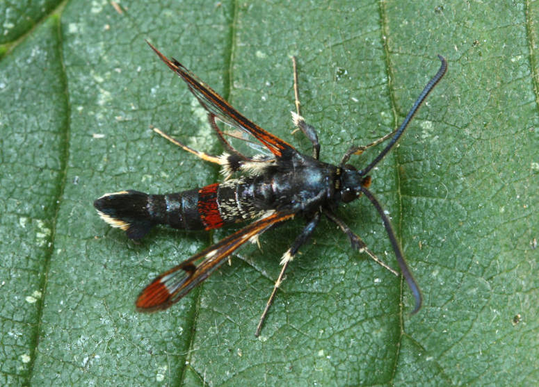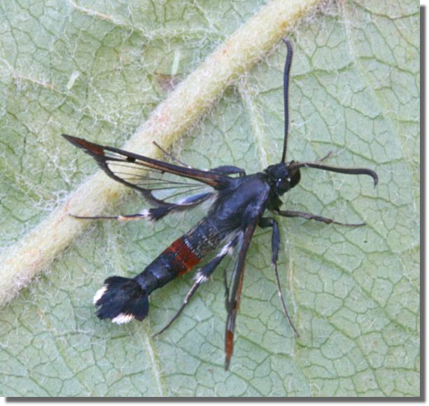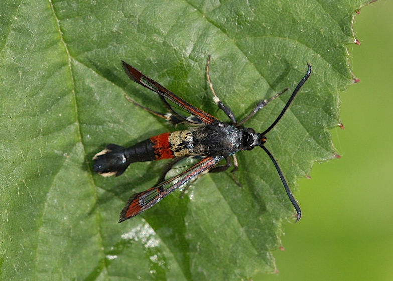 Nationally scarce (Nb) in fens, marshes, river-banks, damp areas, gravel pits and ponds in southern England, northwards to Dumfriesshire, and southern Wales; rare in Ireland. In Hampshire found in small numbers in suitable habitat in both the north and south of the county, and probably under-recorded; the same is true of the Isle of Wight, where it was first found in 2015 but has been annual since. Wingspan 17-19 mm. Day-flying. The early stages may be sought during the winter months, but synthetic pheromone lures are used to attract males nowadays, and this has led to a marked increase in records of the species in recent years. Larva feeds within stems and wood of Osier, Willow and Sallow.