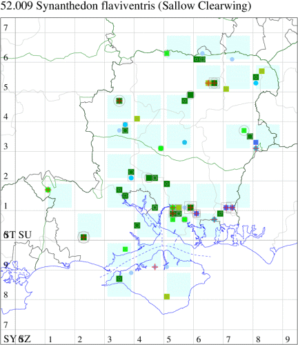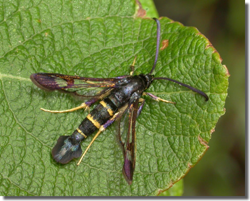 Nationally scarce (Nb) in damp woodland and heathland in central southern and south-eastern England; adults appear only in even years. In Hampshire where the species was discovered new to Britain in 1926 near Southampton, the galls made by the larva of this species on Grey Sallow Salix cinerea are sometimes locally common in the winters of "even" years, mainly in the south-east of the county, but the insect is often heavily parasitised. There are a few scattered records from the Isle of Wight. Wingspan 17-20 mm. Day-flying. The early stages may be sought during the winter months, but synthetic pheromone lures are used to attract males nowadays, and this has led to a marked increase in records of the species in recent years. Larva feeds within stems of Sallow, over-wintering twice.
