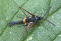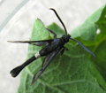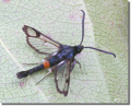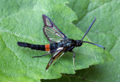 Large Red-belted Clearwing, but the sizes overlap and it can be distinguished by the lack of an orange-red suffusion at the base of the forewings and whitish palps. Larva feeds within bark of Apple, Rowan, Pear and Almond.