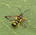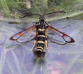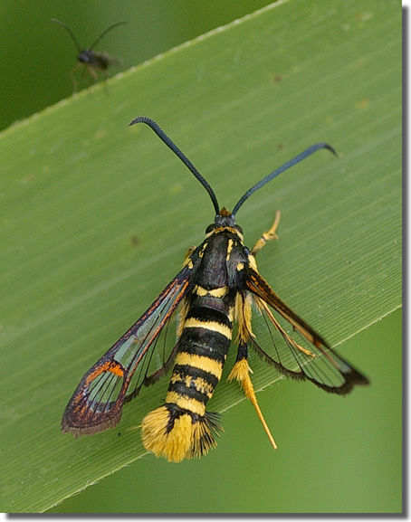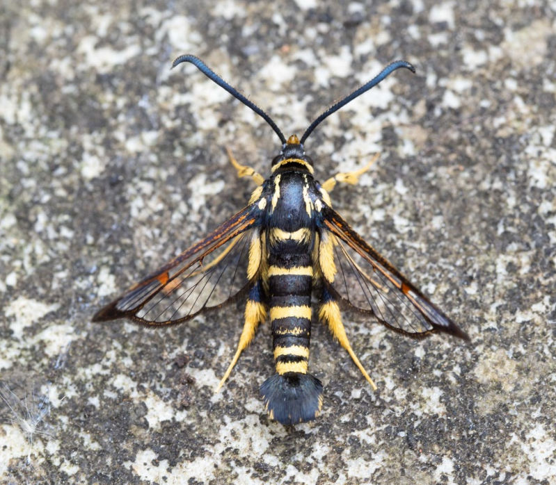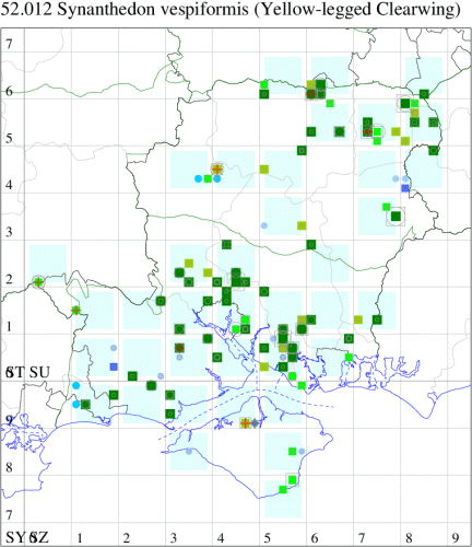 Nationally scarce (Nb) in open woodland, parks and hedgerows in central southern England northwards to Yorkshire; occasionally locally common in gardens and on allotments. Probably under-recorded in Hampshire and on the Isle of Wight, where the extent of known records correlate with those areas in which the recording effort is concentrated. Wingspan 17-24 mm. Day-flying, occasionally seen in flight in woodland where oak trees have been felled. The early stages may be sought during the winter months, but synthetic pheromone lures are used to attract males nowadays, and this has led to a marked increase in records of the species in recent years. Larva feeds in the bark of Oak, Silver Birch, Downy Birch, Wych Elm and English Elm; larval workings may sometimes be found in abundance between the bark and wood of one-year-old oak stumps.
