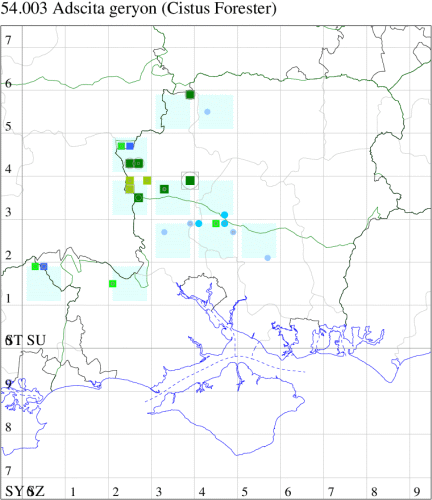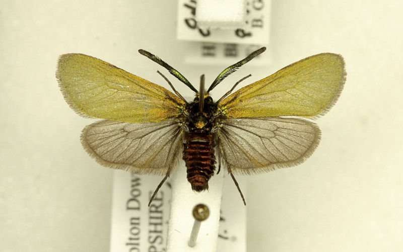 Nationally scarce (Nb) on calcareous grassland, favouring south-facing hillsides, formerly widespread across much of southern England and Wales, now gone from many localities where it was once plentiful. In Hampshire restricted to the western end of the chalk, but reported with regularity only from West Down, Chilbolton. Not recorded from the Isle of Wight to date. Wingspan male 19-25 mm, female 18-22 mm. Day-flying. Very similar to