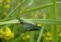 Scarce Forester Jordanita globulariae, from which distinguished by minute differences in the antennae but dissection may be required for accurate determination of individuals found on new sites. Larva feeds on Common Rock-rose.