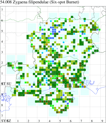 Common on flower meadows, roadside verges, downland, woodland rides and sand-dunes throughout the British Isles, predominantly coastal in the north of its range. In Hampshire and on the Isle of Wight by far the commonest and most widely distributed burnet moth, about four times more numerous than the second most frequent burnet moth,