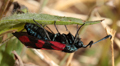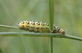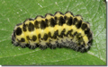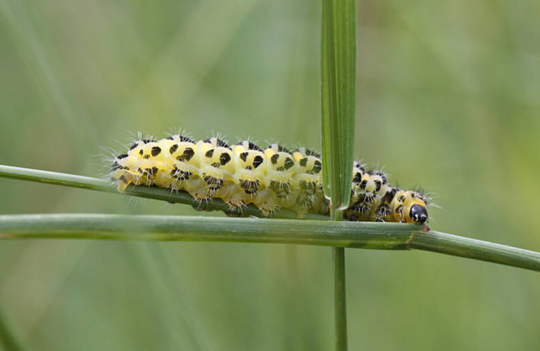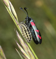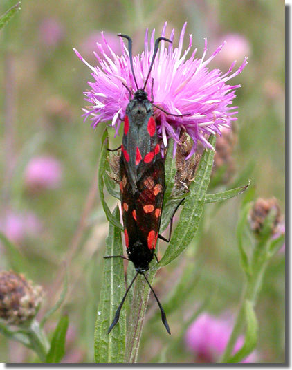 Narrow-bordered Five-spot Burnet Z. lonicerae. Wingspan 25-39 mm. Day-flying. Unmistakable — no other British species of burnet moth has six spots. Larva feeds on Bird's-foot Trefoil and Horseshoe Vetch, over-wintering at least once.