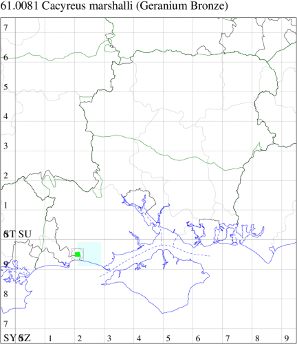 Recorded infrequently through accidental importation in pelargoniums from South Africa. In Britain found rarely in gardens and parks, first found in East Sussex in 1997. Recorded reliably in our area for the first time in Highcliffe, Dorset (VC11) on 10 September 2006, when at least 10 were seen over a period of a week, and it was one of the most common butterflies in the local area at that time (ignoring a report from a garden in Winchester in 1999 or 2000 which was retrospectively identified from a photo). Larva feeds on Geranium, and the Highcliffe record above presumably relates to a local breeding event occurring, either from accidental importation or, less likely, a primary immigrant.