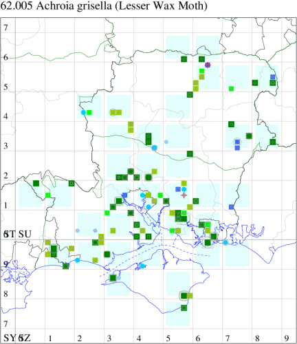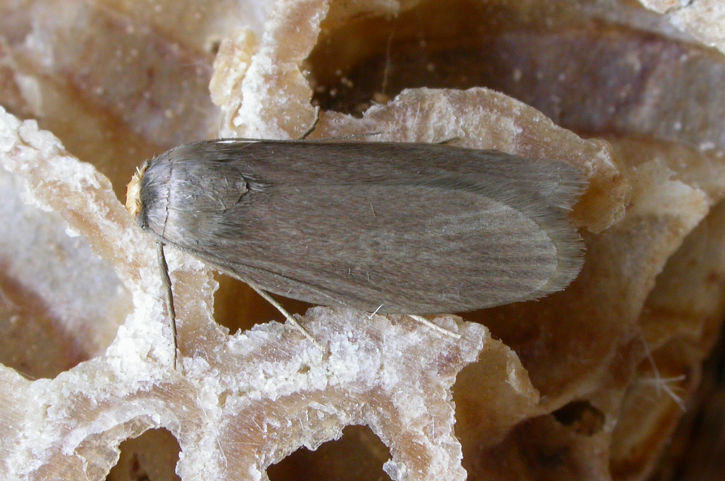 Local throughout much of the British Isles, except for Scotland. Less common than previously due to improvements in bee-keeping practices. Most records originate from the southern third of Hampshire, particularly along the Test and Solent, and quite scarce in the north of the county; since 2010, recorded annually in the Isle of Wight where it was previously virtually unknown. Wingspan 16-24 mm. The characteristic shape, yellow head and absence of wing-markings facilitate identification [Goater]. Larva feeds on beeswax, dead insects and dried fruit; can be a pest of beehives.