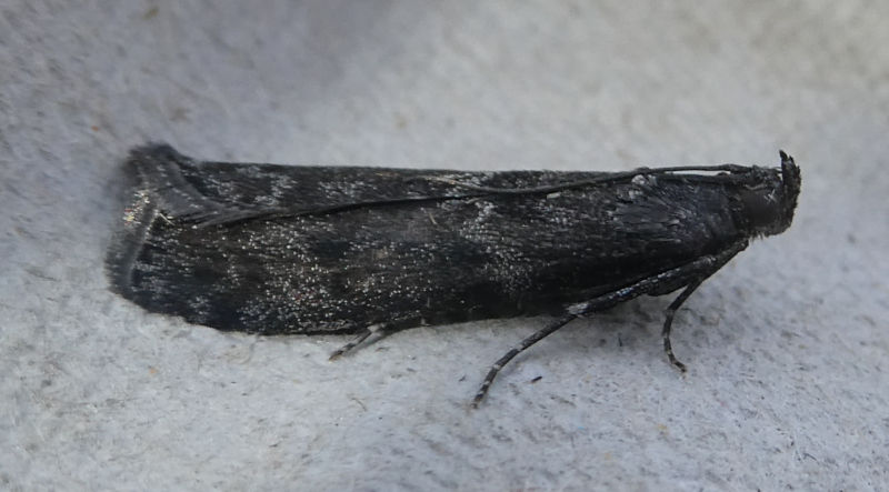 Apomyelois bistriatella, which is broader-winged, first line is whiter and curves on to dorsum, second line curves in middle towards termen and hindwing is more opalescent with more distinct border [Goater]. Larva feeds on Heather and Bilberry, living within a spinning.