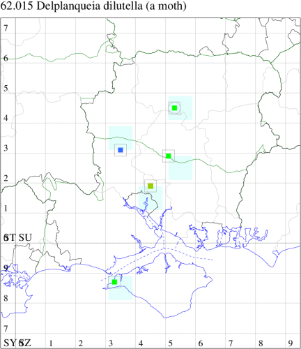 The status of the present species is still being established - old records in our region ascribed to dilutella are assumed to refer to inscriptella, with dilutella sensu stricto only having been confirmed from Cornwall, Ireland, the Isle of Man and Scotland; the mapped distribution reflects this assumption. Wingspan 18-23 mm.