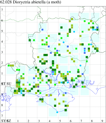 Common in pine woodland throughout southern England, also appearing as a migrant from mainland Europe away from the vicinity of pines. In Hampshire and on the Isle of Wight closely associated with Scots Pine, and fairly common in the county. Wingspan 27-33 mm. The genus