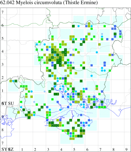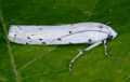 Common on rough ground and chalk downland throughout southern Britain. Widespread and common in Hampshire and the Isle of Wight. Wingspan 27-33 mm. Considerable larger than the superficially similar Yponomeuta, and with fewer and larger black spots, with Y. sedella perhaps the closest match in pattern. Larva feeds on flowers and stems of Greater Burdock.