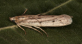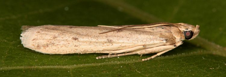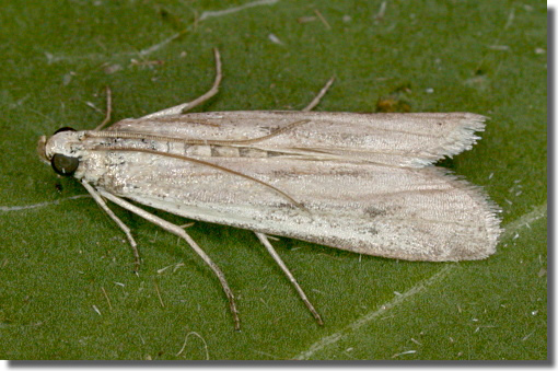 Phycitodes binaevella, though a more delicate-looking insect, and characterised by the pale coloration, weak markings, and above all by the dark shadow along the outer-half of the costa of the forewing [Goater]. Larva feeds within flowerheads of Spear Thistle.