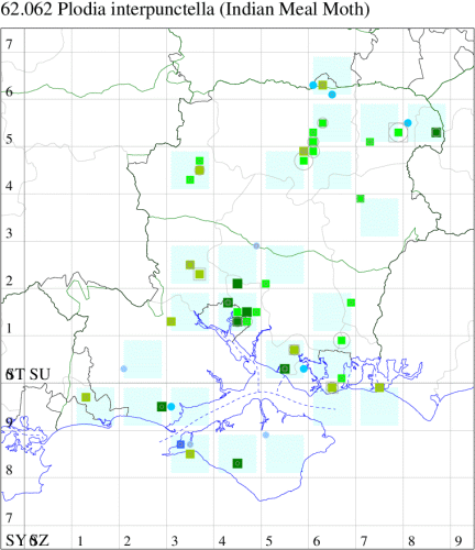 Local in barns, warehouses and granaries, also sometimes in and around houses, throughout the British Isles, rarely recorded in the wider countryside. Thoroughly naturalised, through accidental introduction in dried goods, and now a frequent, often abundant, pest of warehouses, first recorded in Britain in 1847. Distributed erratically across Hampshire and on the Isle of Wight, where often found in bird seed and similar products, from pet shops. Wingspan 14-20 mm. Larva feeds on dried goods, cereals, grain, dried fruit, nuts and dead insects, causing sufficient damage to be a serious pest in some areas.