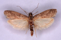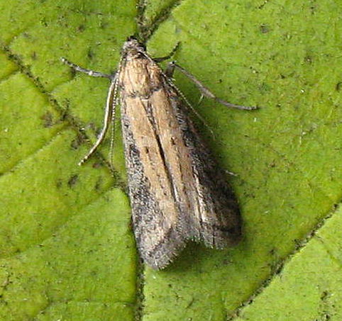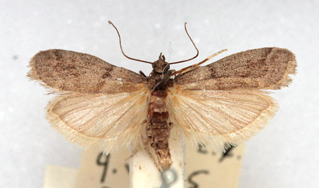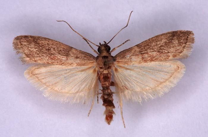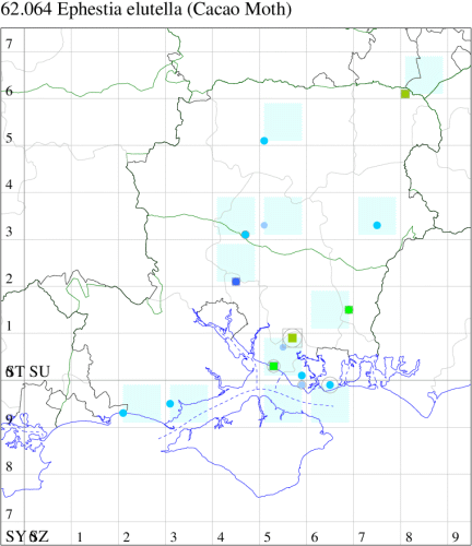 E. unicolorella predominates. Occasionally recorded at light traps in the south, but undoubtedly overlooked. Thoroughly naturalised, through accidental introduction in dried goods, in barns, warehouses and granaries throughout much of the British Isles, where it may still be a pest in warehouses. In Hampshire and on the Isle of Wight scattered records throughout, mostly at light. Wingspan 14-20 mm. One of six very similar species of