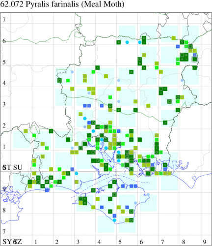 Common in farm buildings, barns, warehouses and granaries, also sometimes in houses, across much of Britain, occasionally recorded in the wider countryside. Distributed widely and evenly over Hampshire and on the Isle of Wight, with no particular pattern. Wingspan 22-30 mm. Nocturnal, but often easy to find on walls during the day. Main confusion species are