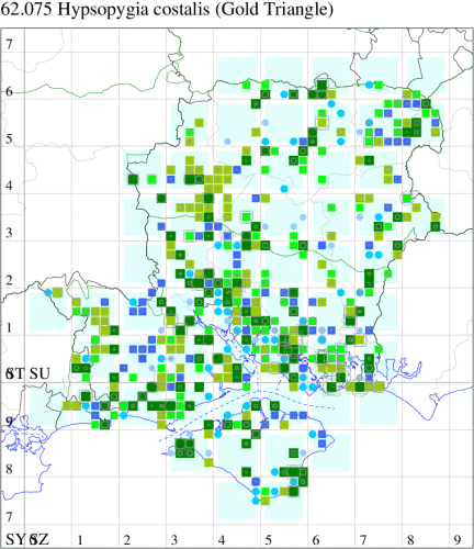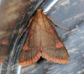 Common in gardens, woodland and farmland throughout southern England. Widespread and common in Hampshire and on the Isle of Wight. Wingspan 18-22 mm. One of the brightest-coloured and most easily recognisable micros, it has two distinct resting postures. Larva feeds on dry vegetable matter, hay and dead grasses.