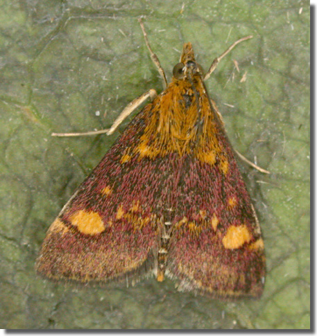 P. purpuralis has a rounded leading edge to the dorsal cream spot. Note that the purple scales apparent when freshly emerged quickly wear off and leave just a brown appearance. Larva feeds on Mint, Marjoram and Thyme, living within a silken tube or tent.