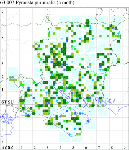 Found on chalk downland and dry, grassy areas, throughout much of Britain favouring very short turf. In Hampshire and on the Isle of Wight, locally common on the downs, and sometimes found in gardens where Thyme is grown. Wingspan 15-22mm. Flies by day and night. At first glance, confusable with