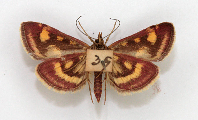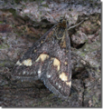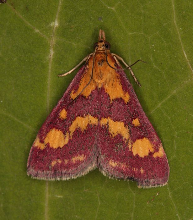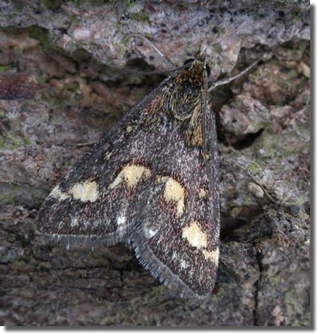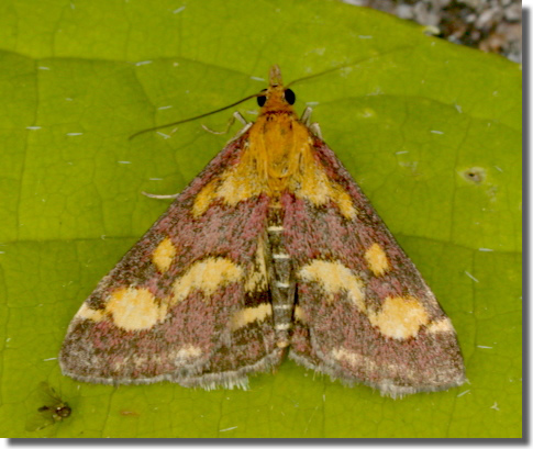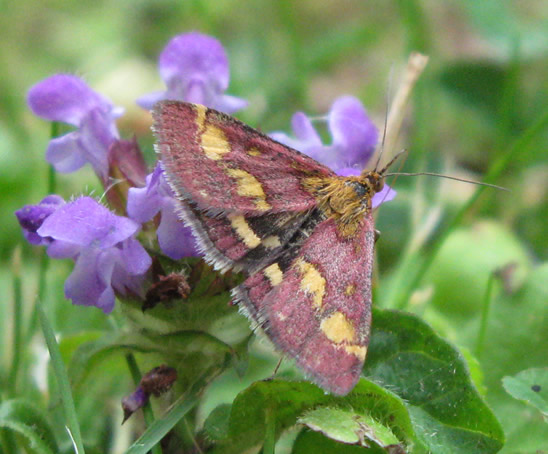 P. ostrinalis for differences. Note that the purple scales apparent when freshly emerged quickly wear off and leave just a brown appearance. Larva feeds on Wild Thyme and Large Thyme and sometimes Corn Mint, living within a silken tube or tent.