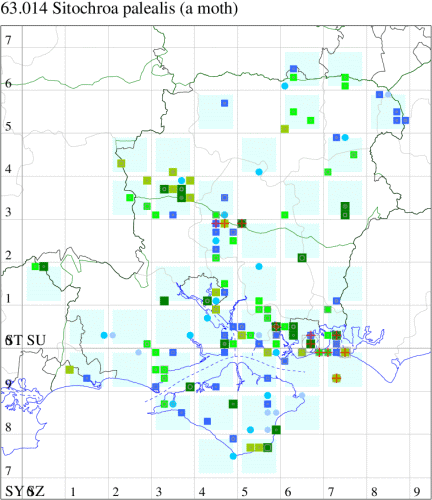 Local on heathland, downland, waste ground and cliff-tops throughout much of southern England and East Anglia. In Hampshire and on the Isle of Wight an immigrant which has become established; since 1990, singletons have been seen regularly, and breeding colonies are established, perhaps temporarily, in several localities on the coast and across the chalk downland. Wingspan 29-34 mm. Fairly unmistakable: pale sulphur-yellow when fresh, fading whiter with age, but always with prominent veins. Larva feeds on flowers and seeds of Fennel, Wild Carrot, Pepper-saxifrage, Hogweed and other umbellifers.