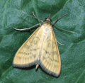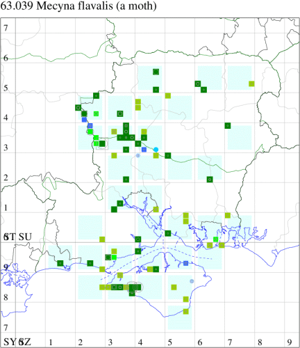 Rare (proposed as a future Red Data Book species) on chalk downland and grassy slopes in parts of southern England, predominantly coastal. In Hampshire and on the Isle of Wight the species has two strongholds where it is common, on Porton, Broughton and Stockbridge Downs on the mainland, and Compton Down on the Island. Occasional specimens encountered away from these localities suggest that there may be other, perhaps small, colonies still undetected. Wingspan 25-29 mm. Both wings have a very narrow, dark terminal line and greyish cilia, producing a sharply pencilled outline to the wings which, together with the presence of a third stigmatal spot in the forewing, makes this species easy to recognise [Goater]. Larva feeds on Hedge Bedstraw, Field Woundwort, Black Horehound, Small Nettle and Mignonette.