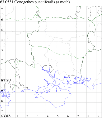 Recorded infrequently through accidental importation in fruit from Asia, and most likely to be found in fruit and vegetable wholesalers and supermarkets. Not recorded in Hampshire or on the Isle of Wight to date. Wingspan 20-23 mm. Adults are yellow and covered with black spots on the forewings, hindwings and abdomen. Larva feeds on the skin of young and mature durian fruit, guava and several other hosts including citrus trees, papaya, eggplant, mango, cotton and apple, no evidence of breeding in the UK.