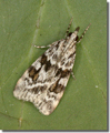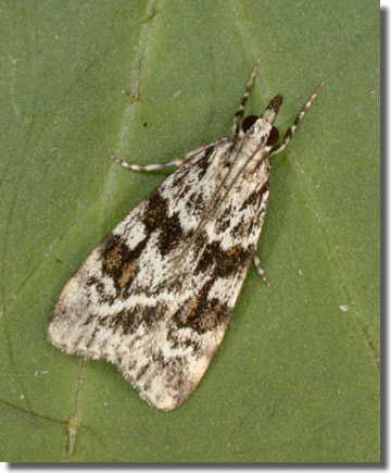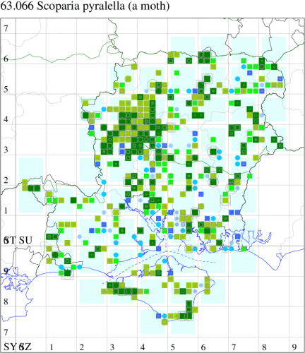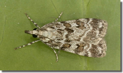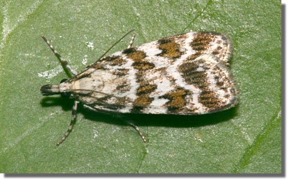 Common on chalk downland and waste ground throughout much of Britain, less numerous in Scotland. In Hampshire and on the Isle of Wight widespread and common. Wingspan 17-20 mm. Although this is a variable species, it is usually easy to recognise by the rather short, broad wings, contrasting pattern and the distinctly ochreous rather than grey hue [Goater]. Despite most published literature stating that the larva feeds on various mosses and decaying vegetable matter, Bob Heckford (pers comm) has said that there is no confirmed record of the larva feeding on any moss species that he is aware of. In fact he and Stella Beavan may be the only people alive in Britain who have found the larva, feeding on dead leaves of Plantago lanceolata.