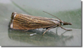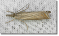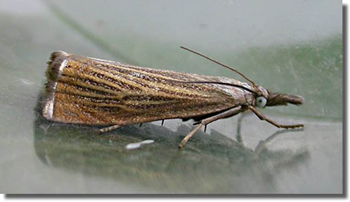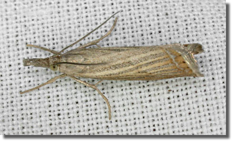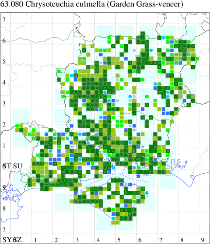 Common in grassland, rough meadows and gardens throughout the British Isles. Widespread and very common in Hampshire and on the Isle of Wight. Wingspan 20-24 mm. Diagnostic, silvery V-shaped postmedian line is always visible. Larva feeds within roots of various grasses, causing sufficient damage to be a serious pest in some areas.