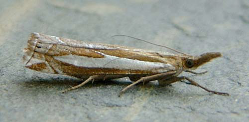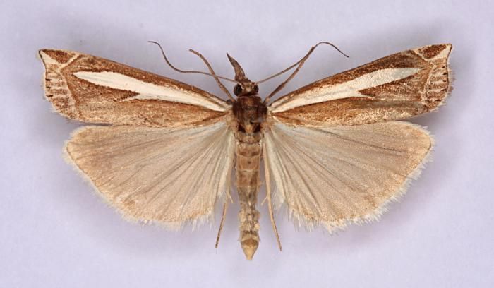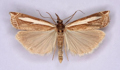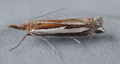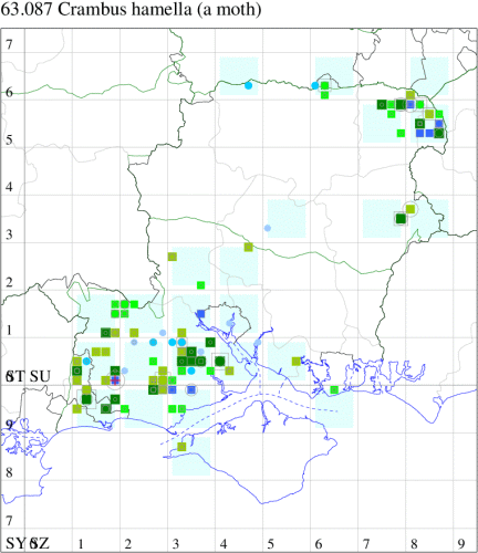 Nationally scarce (Nb) on dry heathland, in England and southern Scotland. In Hampshire locally common in the New Forest and in similar habitat in the north-east, but extremely scarce elsewhere in the county. Recorded for the first time on the Isle of Wight in 2016, when two were reported on the same night from the west of the island on 24 August, most likely having made the short hop across the Solent from the New Forest. Wingspan 24-27 mm. The characteristically shaped longitudinal stria precludes confusion with any other species [Goater]. Larva feeds on Wavy Hair-grass.