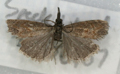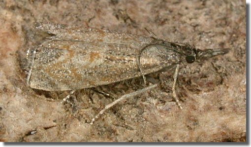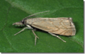 Chrysoteuchia culmella, though much smaller and with quite different cross-lines [Goater]. Larva feeds within roots of various grasses and Sedge.