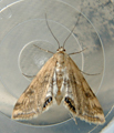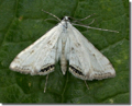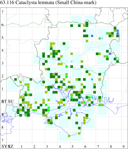 Common around ponds and reed-beds throughout the British Isles. In Hampshire locally common in suitable habitat, especially along the coast between Southampton and Gosport, and in north-east Hampshire; apparent increases in recent years may be due to increased observer coverage, but it remains very rare on the Isle of Wight. Wingspan male 18-19 mm, female 22-24 mm. Females nocturnal, males fly in the afternoon. Unmistakable. Larva feeds on Common Duckweed, Bulrush and Unbranched Bur-reed, living mostly underwater.