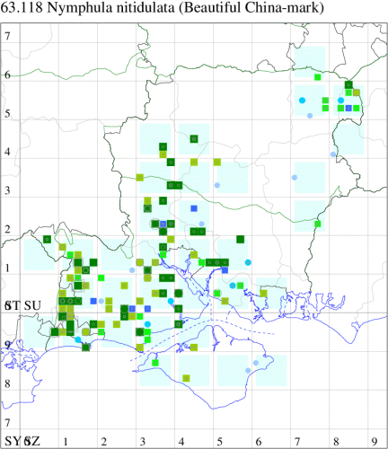 Local in ponds throughout much of Britain. In Hampshire widespread in the south, but in the northern half of the county, largely restricted to the north-east. Recorded on the Isle of Wight for the first time since 1952 at Freshwater in 2000. Wingspan 20-25 mm. Smaller and whiter than Brown China-mark Elophila nymphaeata; lightly marked specimens could be mistaken for male Ringed China-mark Parapoynx stratiotata, but in that species the forewing discal spot is a closed circle [Goater]. Larva feeds on Branched Bur-reed, Unbranched Bur-reed, Yellow Water-lily and other water plants, living entirely underwater.