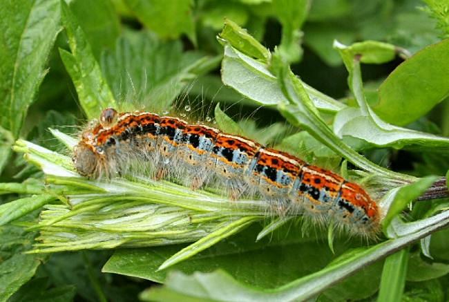 Lackey M. neustria, but cross-lines roughly parallel in Lackey, whereas in Ground Lackey they converge towards the middle. Larva feeds on Common Sea-lavender, Sea Wormwood and other herbaceous saltmarsh plants, over-wintering as an egg.
