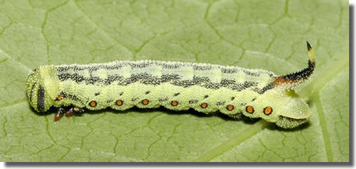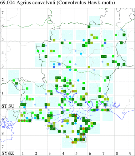 A fairly common migrant from southern Europe, appearing in the south and east, with occasional major influxes (as in 2003), when breeds in small numbers; scattered records throughout Hampshire and the Isle of Wight, most common on the coast, becoming progressively less common inland. Wingspan 94-120 mm. Larva feeds on Field Bindweed and Hedge Bindweed, and also on Morning Glory in gardens, unable to over-winter in significant numbers.
