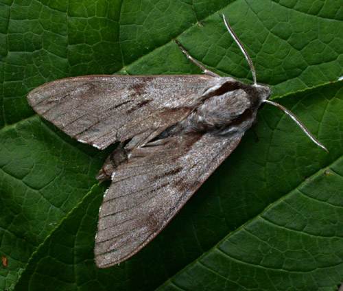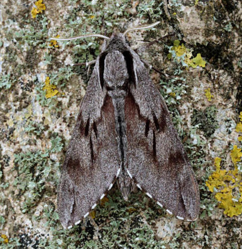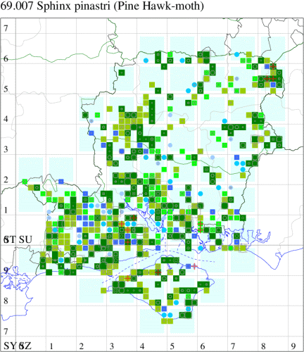 Local in coniferous woodland, plantations, heathland and gardens throughout much of south-eastern England. In Hampshire and on the Isle of Wight a species which has spread rapidly since the middle of the 20th Century, but has declined since, although still widespread but never common wherever there are pine trees. Wingspan 72-80 mm. Unmistakable, there are three or four black dashes in disc, and the forewing fringe is chequered. Larva feeds mainly on Scots Pine and Norway Spruce, but also on Maritime Pine and Cedar-of-Lebanon, over-wintering as a pupa.