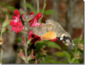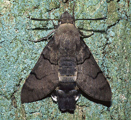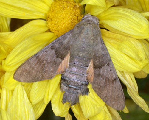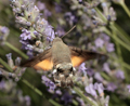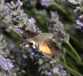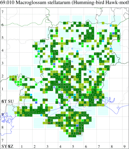 Common immigrant from southern Europe, appearing throughout the British Isles, in some years arriving in sufficient numbers to breed. In Hampshire and on the Isle of Wight appears annually in varying numbers, and on average increasing year on year. Has been recorded in winter, and is known to hibernate, and therefore spring records likely refer to overwintering individuals rather than new immigrants. Wingspan 50-58 mm. An unmistakable diurnal moth, which hovers to nectar from the flowers of many plant species, amongst which are Aubrieta, Buddleia, Viper's Bugloss Echium vulgare, Red Valerian Centranthus ruber, Honeysuckle Lonicera, Nepeta, Petunia, Jasminum and Pulmonaria. Larva feeds on Lady's Bedstraw, Hedge Bedstraw and Wild Madder.