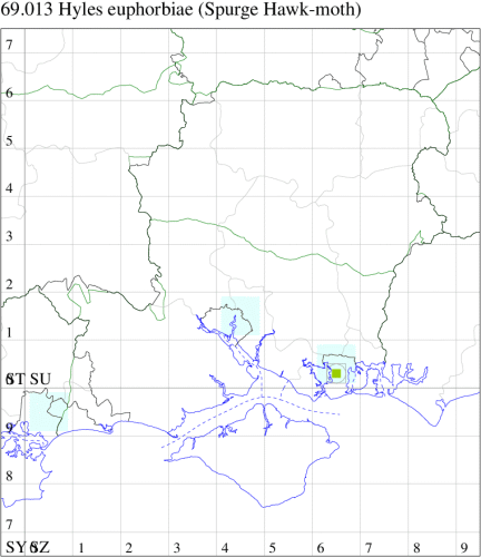Bedstraw Hawk-moth H. gallii, but that species has narrow central stripe on forewing, which does not reach the costa. Larva feeds on Wood Spurge, no evidence of breeding in the UK.