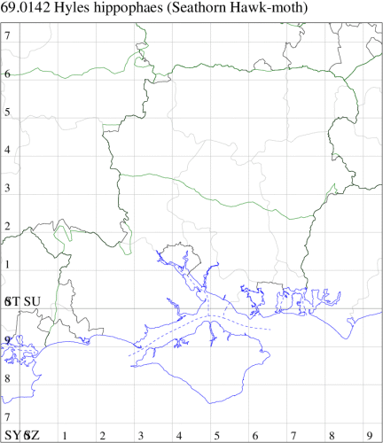 Very rare immigrant (less than 10 previous UK records) to the south coast of England from southern Europe, two larvae of this normally sedentary species were found on 20 August 1954 feeding on Common Toadflax at Thurlestone on the South Devon coast. Not recorded in Hampshire or on the Isle of Wight to date. Wingspan 68-72 mm. Larva feeds on Sea Buckthorn; no evidence of breeding in the UK.