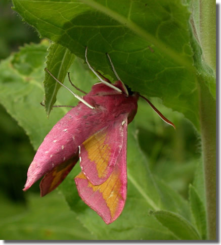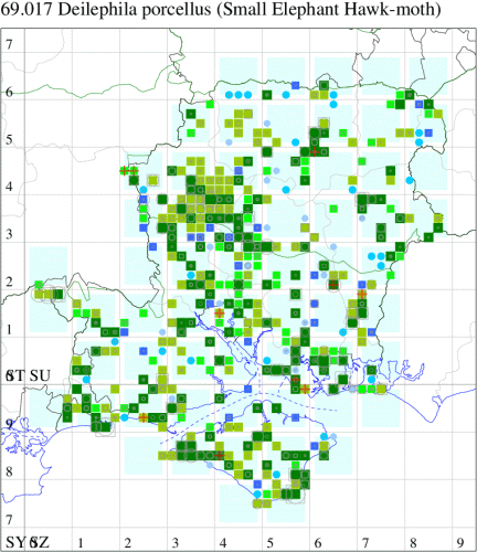 Local in calcareous grassland, chalk downland, heathland, sand-dunes, shingle beaches and damp grassland throughout much of England and Wales. In Hampshire and on the Isle of Wight still common on chalk downland, and also occurs on coastal shingle and sandhills, with occasional wanderers elsewhere. Wingspan 47-56 mm. Elephant Hawk-moth D. porcellus is superficially similar, but larger, with forewing olive-green and pink, not yellow and pink. Larva feeds on Lady's Bedstraw, Hedge Bedstraw, Heath Bedstraw, Marsh Bedstraw, Rosebay Willowherb and Purple Loosestrife, over-wintering as a pupa.